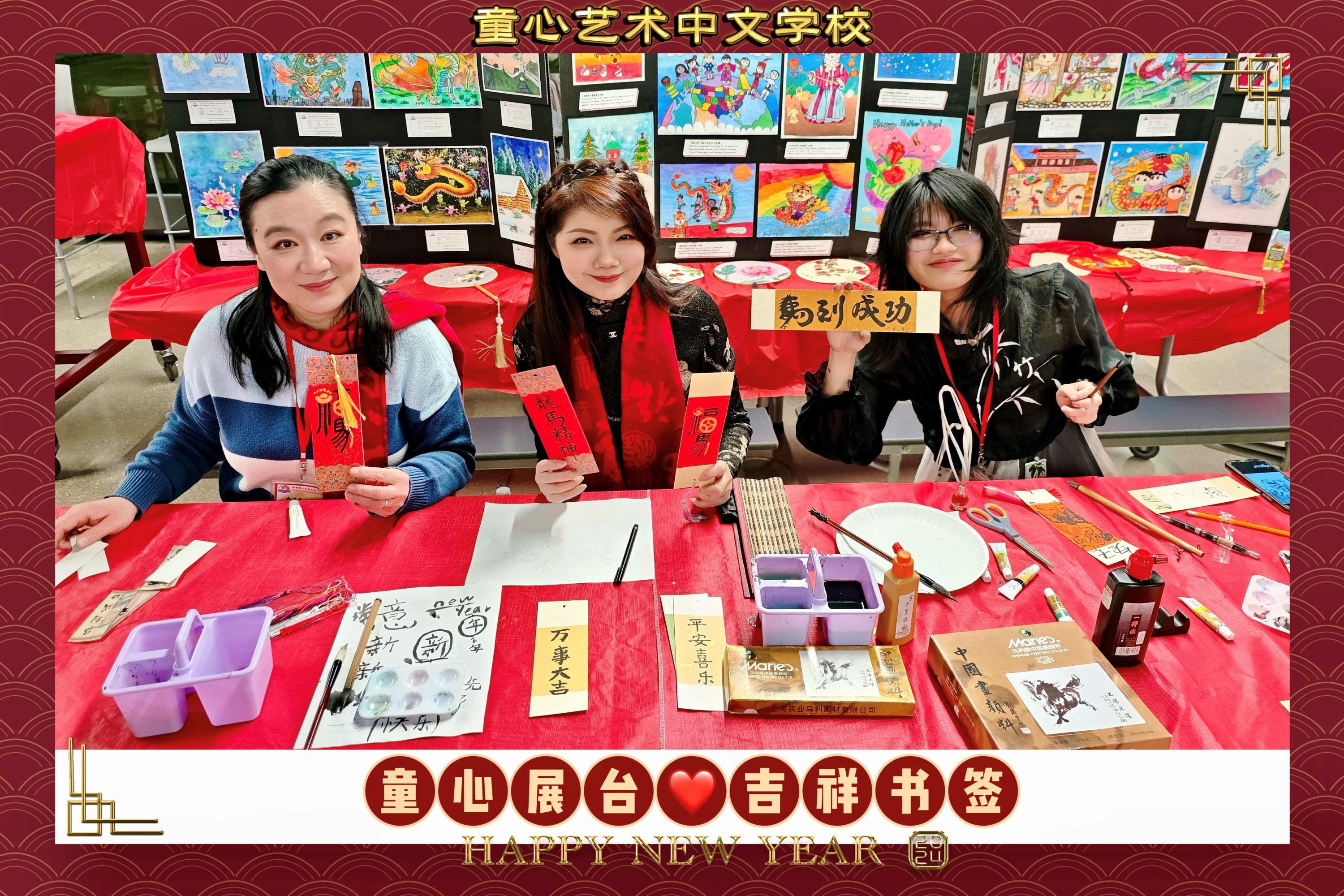 活动伊始,身披春节红围巾的童心中校老师们和助教们一直在长桌展台前后忙碌。书画班和中文班的老师们挥毫泼墨,在精美的书签和红色宣纸上为前来体验的学生和国际友人们书写中文姓名、吉祥祝福以及精美的国画小品。一张张书签不仅是春节礼物,更承载着中华文化的祝福与温度。许多学生排队等候,期待拥有一张珍贵的中文名字书签。也有国际友人表示,这是他们第一次如此近距离接触中国书法艺术,对其独特魅力深感新奇与赞叹。童心的书画展台前一直人流不断,老师们笔下生花,成为活动现场最靓丽的那道文化风景线。